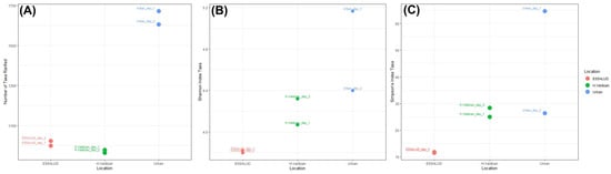 Alpha diversity analyses. (A) Number of ASVs rarified according to taxa. (B) Shannon Diversity Index and (C) Simpson’s Diversity Index (ASV: amplicon sequence variants).