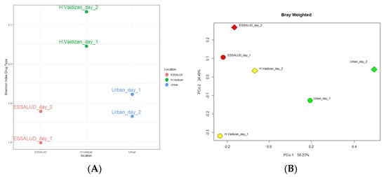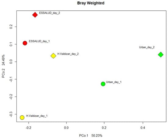 The alpha diversity analyses (bacterial richness and Shannon and Simpson indices) based on 16S rRNA analyses indicate that, in the city of Huanuco, the urban sewage samples tended to have higher taxonomic diversity and richness compared to the samples collected from hospitals. The Bray–Curtis index demonstrates differences in beta diversity of bacterial populations between locations, i.e., hospitals and urban dwellings. Approximately 74% of the variance between the bacterial composition at each location was explained in the weighted Bray–Curtis index, respectively, with the H. Valdizan samples showing maximum dissimilarity from the urban and ESSALUD samples (Figure 2 and Figure 3).