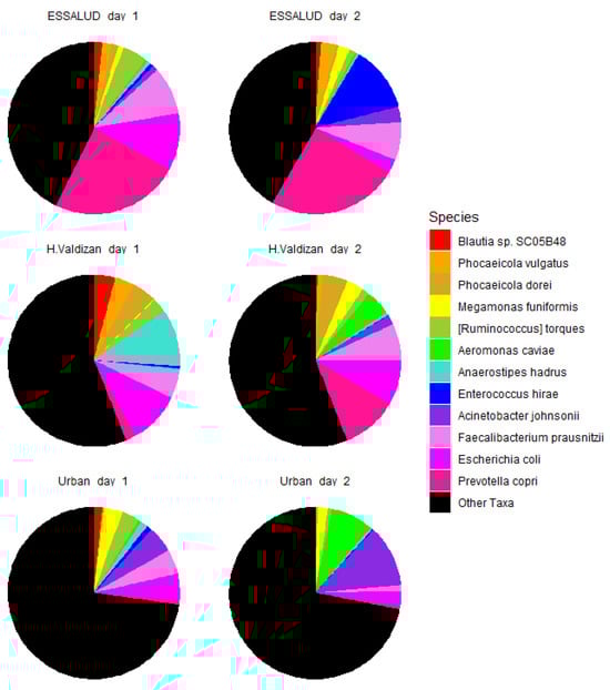 The sewage location influenced the taxonomic diversity between samples. For instance, the ESSALUD hospital shows the highest abundance of Prevotella copri among all the wastewater samples. Conversely, the urban biospecimen portrayed the highest abundance of Aeromonas cavie compared to those collected from the two hospitals. Even though these proportions were similar between the first and the second sample, some differences in taxa abundance were observed between days for all sites (Figure 4).