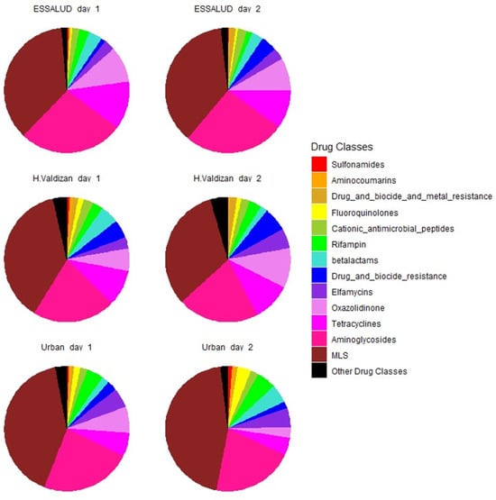 Peru has been facing the dual consequences of the epidemiological transition in recent decades, with prevailing infectious diseases and increasing rates of non-communicable conditions []. In our study, we have demonstrated high levels of ARG related to beta-lactams, monobactams, macrolides, and even modern antibiotics such as oxazolidinone or last-resort antibiotics (i.e., carbapenems), especially in samples from the social insurance hospital (ESSALUD) in the city of Huanuco. This is concerning as it suggests that even in remote areas, AMR is becoming increasingly prevalent.