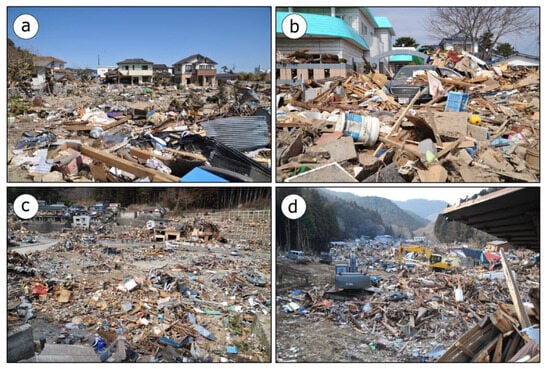 Tsunami following earthquakes have the potential to cause significant damage in coastal areas and create a large amount of sludge from the bottom of the sea that contains chemical substances, heavy metals, oils, and pathogenic microorganisms. The 2011 Tōhoku tsunami left behind approximately 20 million tons of wrecks, or debris, and 10 million tons of soil sediments, composed of mud and sand, on the ground [40] (Figure 3). The treatment and removal of dried tsunami sludge from the affected areas adversely affected public health.