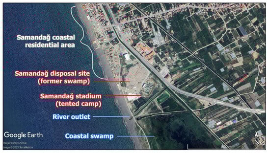 A typical and very recent example of an uncontrolled disposal of earthquake debris in a natural habitat comes from East Anatolia and in particular the Samandağ coastal area of Hatay province, which was profoundly impacted by the devastating earthquakes that occurred in early February 2023. This site was created in a coastal zone with geological, geomorphological, and historical features that make it particularly vulnerable to human intervention and activity [31]. It was created within a coastal marsh, very close to the outlet of a stream (Figure 4) and in close proximity to residential areas, such as the town of Samandağ and its suburbs, and adjacent to emergency shelters (Figure 4), with all that this implies for public health safety [31].