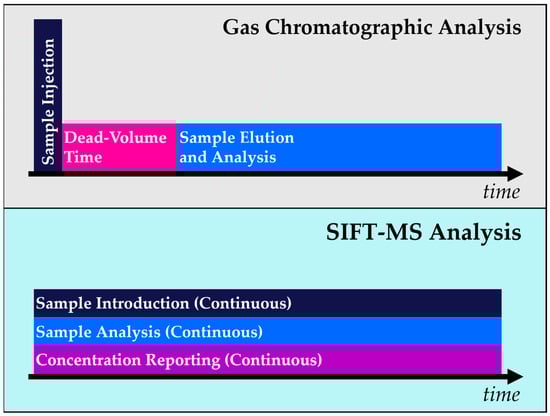 In contrast, SIFT-MS is a direct-injection mass spectrometry (DIMS) technique in which air is introduced, analyzed, and reported continuously (Figure 1). The reporting rate depends on the analytical method but is typically from 5 to 120 s for multiple analytes at sub-ppbV concentrations.