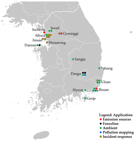 Published air monitoring campaigns (colored according to application) using SIFT-MS have primarily occurred in the more populous and industrial northwest and southeast regions of South Korea. (Map of South Korea, on which annotations have been made, is from https://commons.wikimedia.org/wiki/File:Map_of_Korea-blank.svg, by FriedC, CC3.0; accessed on 2 June 2023).