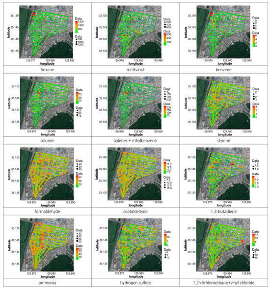 Pollution maps for 12 selected HAPs were generated from concentration data collected by a SIFT-MS instrument mounted in a moving laboratory traversing roads in the Sasang industrial area (Busan, South Korea) [68]. Concentration ranges shown depend on the analyte. Reproduced with permission from Dr S. Choi, J. Korean Soc. Urban Environ.; published by Korean Society of Environmental Engineers, 2021, under Creative Commons Attribution 4.0.