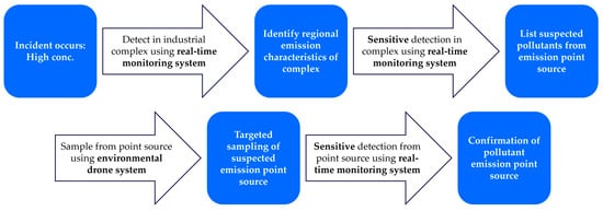 Schematic overview of the NIER pollution incident workflow using a real-time monitoring system (SIFT-MS) and drone sampling. Updated and redrawn from [54] with permission of Dr B.-J. Gong, NIER.