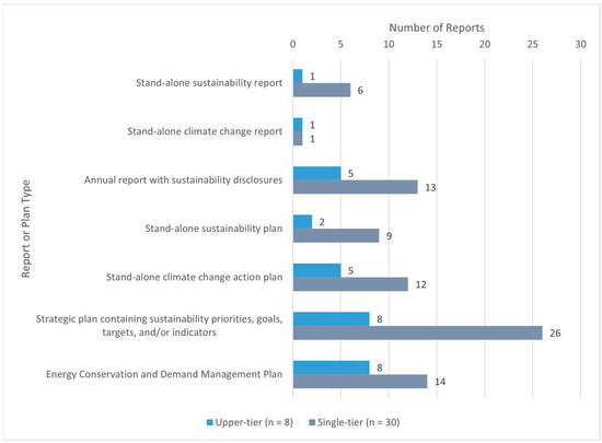 As shown in Figure 1, only one of the eight upper-tier municipalities (13%) and six of the 30 single-tier municipalities (20%) published a stand-alone sustainability report on their website. Combined (upper-tier and single-tier), seven of the 38 municipalities (18%) analyzed reported on sustainability performance in a stand-alone report. Additionally, one out of the eight upper-tier municipalities (13%) published a climate change report. Meanwhile, only one out of the 30 single-tier municipalities (3%) published a climate change report. Five of the eight upper-tier municipalities (63%) and 13 of the 30 single-tier municipalities (43%) included sustainability disclosures in their annual reports. All municipalities that published an annual report beyond their audited financial statements included some form of sustainability performance information. Lastly, eight out of the eight upper-tier municipalities (100%) and 14 out of the 30 single-tier municipalities (47%) published a current ECDM plan on their website. Overall, stand-alone reports were the least common types of sustainability and climate change documents found across sample municipalities’ websites.