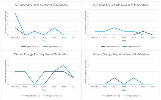 Given that sustainability and climate change reporting is currently voluntary at the municipal level in Ontario, it is not surprising that stand-alone reporting uptake is low [55,66]. Despite reporting being an output of the planning process, our results show that municipalities were producing more plans than reports, which could indicate that additional guidance and reporting requirements are necessary. Lastly, the higher frequency and more recent climate change plan publication rate could relate to available funding through the FCM. This could signal a need for financial stimulus to encourage improved reporting practices.