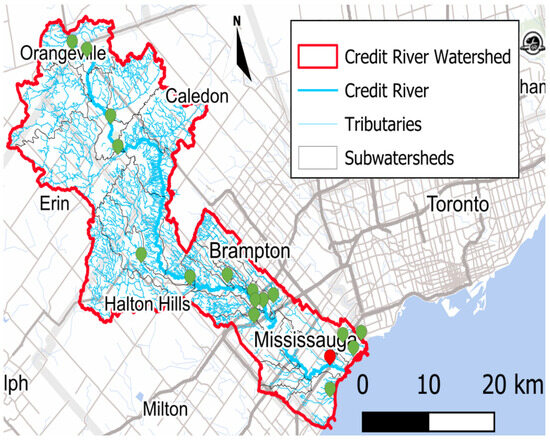 The Credit River is a major river in Southern Ontario, Canada, part of the Toronto Greater Area [43] (Figure 1). Starting at Orangeville, the Credit River stretches for 90 km before finally reaching Lake Ontario [44,45]. The river has a mainly rural configuration in its upper and middle areas, having significant forest coverage [46]. As it approaches Lake Ontario, the urbanization of the river’s area increases [6]. Urban development in the river area, however, endangers aquatic life and the people who rely on the river, increasing the risk of floods [44,47,48,49]. Table 1 compiles the Credit River’s watershed characteristics. Figure 1 shows the location of the studied site in Ontario province.
