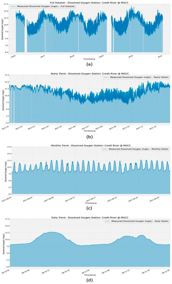 Dissolved oxygen measurement for (a) the whole dataset, (b) one year, (c) one month, and (d) two sequential days at the reference station “Credit River @ MGCC”.