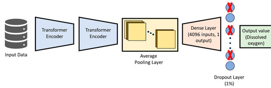 In Figure 4, the input data pass through two transformer structures. Then, their output is processed by an average pooling layer, which connects to a dense layer. The dropout layer [71] is then used to avoid overfitting by relying on an ensemble of different models after the training phase, thus reducing the model’s variance [63,72]. Finally, the forecasted value for dissolved oxygen is output by the DNN-Transformer model.