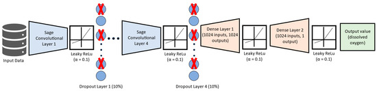Figure 5 feeds the input spatiotemporal data into the GNN-SAGE model. First, they pass through a succession of graph convolutional layers, followed by the Leaky ReLU function [78,79] and a subsequent dropout layer. After four convolution processes, the data are fed to a dense layer containing 1024 inputs and 1024 outputs, followed again by the Leaky ReLU activation function and a final dense layer containing 1024 inputs and 1 output. Finally, future dissolved oxygen values are then generated by GNN-SAGE.
