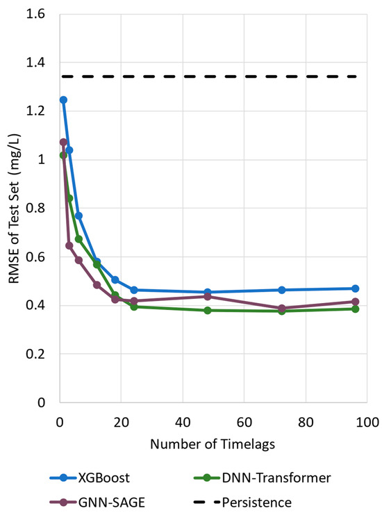 Figure 6 illustrates the evaluated models’ performance using different time lags by using only dissolved oxygen as the input parameter. All the models can surpass the persistence and XGBoost benchmarking for the assessed time lag values, presenting similar behavior: a steep decrease in the RMSE value, followed by convergence after 20 time lags. The deep learning paradigms, DNN-Transformers, and GNN-SAGE benefited more as time lags increased. Both XGBoost and DNN-Transformers presented more stable outcomes when compared with GNN-SAGE, which demonstrated a small variation in its results.