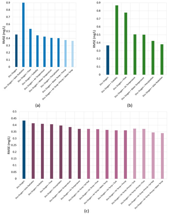 This figure depicts the results for this approach, where the x-axis shows the used input variables combination and, in the y-axis, their respective RMSE values in mg/L. In Figure 7, the lighter the column color, the lower the RMSE value. The effect of different input parameters for dissolved oxygen 6 h ahead estimation using (a) XGBoost, (b) DNN-Transformer, and (c) GNN-SAGE models.