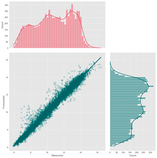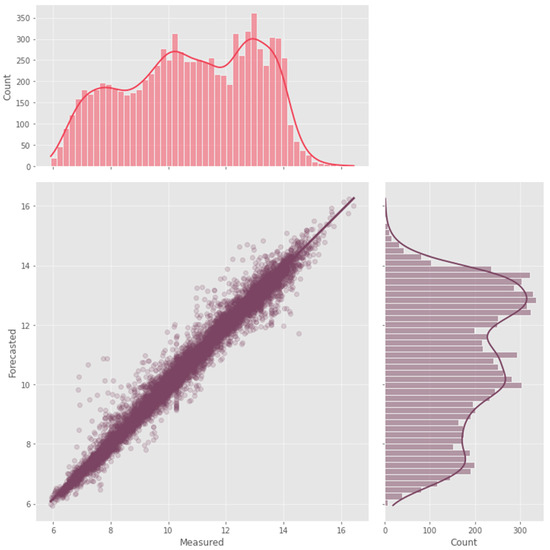 The models XGBoost, DNN-Transformer, and GNN-SAGE can be evaluated by analyzing Figure 8, Figure 9 and Figure 10, which contain a scatter plot and marginal distributions for the real measured dissolved oxygen and the predicted values by the models, in mg/L.