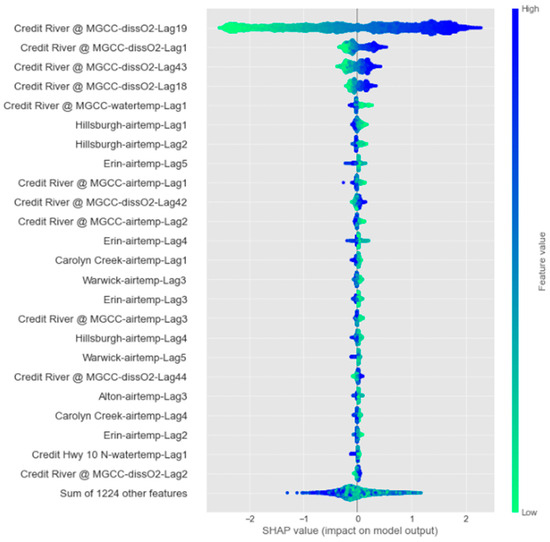 Figure 14 elucidates that using past DO data, i.e., “dissO2-Lag19”, “dissO2-Lag1”, “dissO2-Lag43”, and “dissO2-Lag18”, from the reference station “Credit River @ MGCC” provides the most significant amount of spatiotemporal data for the model’s forecasting. After that, water and air temperatures are other important factors contributing to the model’s DO predictions. For these variables, verifying the relevant influence of spatiotemporal data from the neighboring stations, such as “Hillsburgh” and “Erin”, is important, indicating that the model benefits from their information.