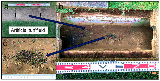 (a) Top view of the ditch; (b) inside view of the ditch; (c) artificial turf fibers (green filaments) and rubber tips (black particles) in the ditch. Blue arrows indicate higher magnifications.