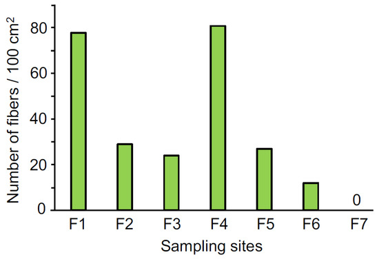Number of artificial turf fibers collected at each sampling site in the artificial turf sports field (F1–F7). No fibers were collected at F7.