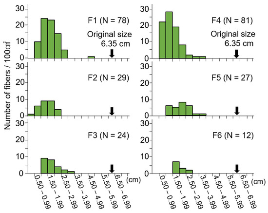 Length of fibers collected at each sampling site in the artificial turf sports field (F1–F6). Original length of the fiber is indicated by arrows (6.35 cm). No fibers were collected at F7.