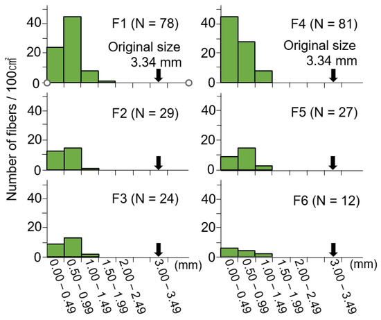 Artificial turf fibers were collected from six of the seven sites (Figure 1, Figure 3 and Figure 4). No fibers were collected at Site 7, where almost no sports activities were being conducted. The number of fibers collected at each site (F1–F6) and their sizes are shown in Figure 5 (length) and Figure 6 (width). All of the collected fibers were smaller in both, length, and width than their original sizes (Figure 3, Figure 5 and Figure 6). The length of the fibers at each sampling site were as follows (cm, mean ± SD, N): F1, 1.65 ± 0.61, 78; F2, 1.38 ± 0.53, 29; F3, 1.76 ± 0.57, 24; F4, 1.41 ± 0.60, 81; F5, 2.10 ± 0.62, 27; F6, 1.98± 0.41, 12. The width of the fibers at each sampling site were as follows (mm, mean ± SD): F1, 0.65 ± 0.26; F2, 0.59 ± 0.22; F3, 0.63 ± 0.27; F4, 0.54 ± 0.29, F5, 0.70 ± 0.27; F6, 0.63 ± 0.39.