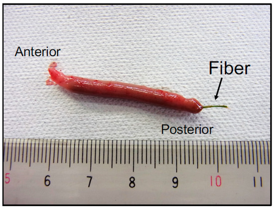 The retention and elimination of fibers in the goldfish intestine were not examined in the present study because the number of ingested fibers was much lower compared to RT ingestion [20]. According to the study by Xiong et al. [29], polyethylene fibers were eliminated after 72 h of ingestion in goldfish. The artificial turf fibers ingested by goldfish under the present conditions would be eliminated within several days because the fibers are soft and do not appear to stick to the intestine.
