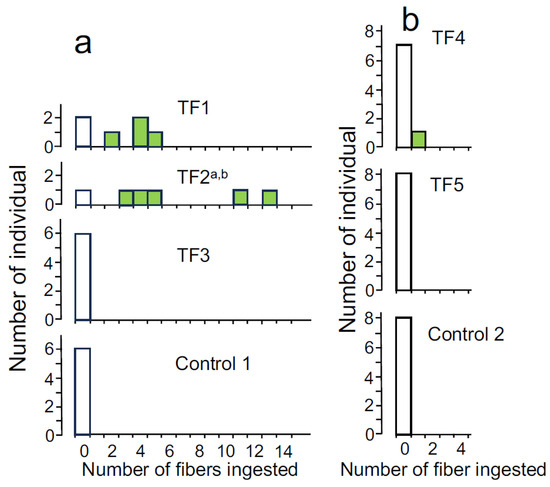 Ingestion of fibers was observed in one goldfish in the experimental group, TF4, but not in the fish in the other groups, TF5, and Control 2 (Figure 9b). There were no significant differences in the number of ingested fibers among the three groups (p > 0.05).