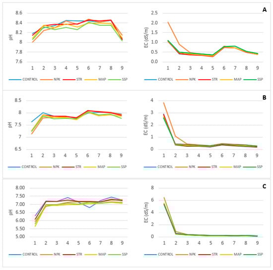 pH and electrical conductivity (dS/m) of leachates in alkaline (A), neutral (B), and acidic (C) soil.
