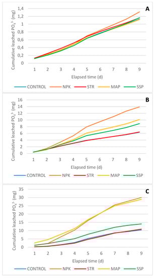 In the alkaline soil, P fertilizers showed a similar behavior (Figure 2A). Soil fertilized with NPK leached the highest amount of P, 1.32 mg PO43−, while the control, STR-, MAP- and SSP-treated soils leached 1.13, 1.16, 1.13, and 1.17 mg PO43−, respectively. These observations imply a loss of 0.61, 0.10, 0.01, and 0.11% of the P applied with NPK, STR, MAP, and SSP, respectively (Table 3). The differences between the treatments were not statistically significant.