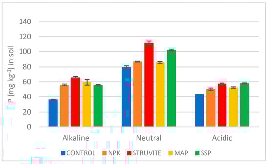 The analysis of the soils after the leaching process showed differences in available P content. In all three soils, the highest available P content was found in those treated with STR, and the results were consistent with those obtained in the leaching assay. Thus, in STR-treated alkaline soil, after the leaching of soluble salts, a slightly higher available P content was observed compared to other P fertilizers.