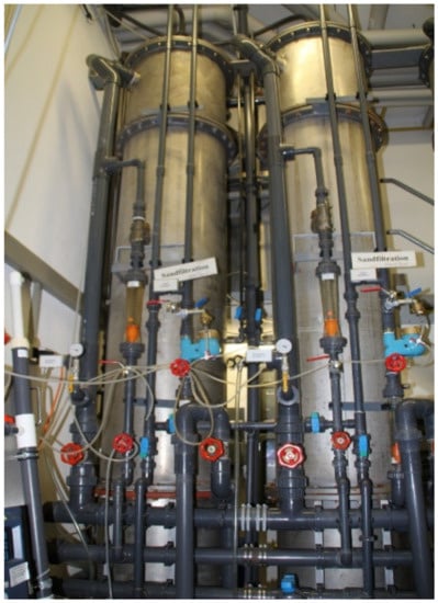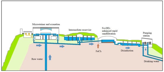 The pilot plant followed the main plant’s processes: water flows through a micro sieve filter (15 µm), and then flows into the customized ozone mixer followed by seven contact tanks. Then, K2FeO4 (ferrate(VI)) and FeCl3 were dosed into two flowing waters separately by peristaltic pumps with the required volume dosage (equivalent to 0.1 mg L−1 as Fe). Water/coagulant mixtures were directed into two separated chambers where suitable flocculation occurred before the flow entered two parallel filter columns (Figure 2) with similar flow conditions. The flow rate for each stream was 1.5 m3 h−1, and the daily test period was 5 h. The two parallel filtration columns have the same configurations (Everzit N and quartz sand) and can be run with either raw water or ozonated water. When using raw water, no ozonation was operated, and then the performance of ferrate(VI) can be compared with that of FeCl3. Both filtrates were collected for the analysis of water qualities. A detailed pilot-plant setup can be seen in [12].