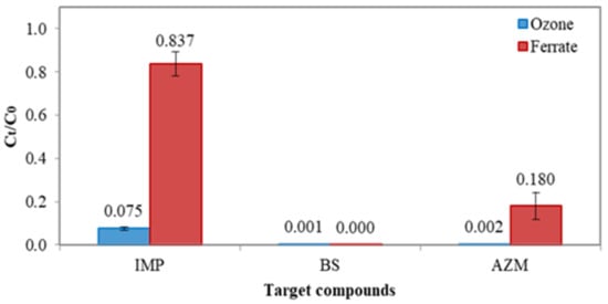 Mean concentration reduction of IMP, BS and AZM with ferrate (VI) and ozonation, respectively. The dosage of ferrate(VI) and ozone was 0.036 mM. Test solution concentration = 1000 µg L−1 and pH = 7.