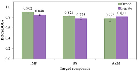 Figure 4 shows that approximately 10–20% of DOC removal in the degradation of IMP, BS and AZM by ozonation and ferrate(VI) treatment, which was relatively lower than the reduction of the compounds’ concentration. Moreover, there was no significant difference between DOC reductions by ferrate(VI) treatment and ozonation. DOC reduction indicates the mineralization of organic compounds, i.e., original organic compounds are converted to form more bio-assimilable molecules such as methane and carbon dioxide [20]. Limited mineralization by ferrate(VI) suggests that ferrate(VI)’s reactivity is mainly based on the functional groups and chemical bonds in the compounds to be treated. On the other hand, limited DOC reduction by ozonation in this study is attributed to the reactions of ozone molecules with the pollutants, which go through the selective reactions as well.