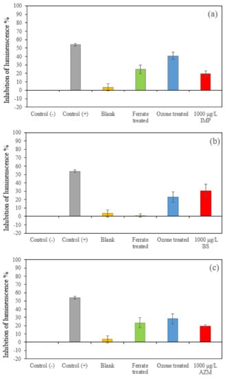 Toxicity of the blank (treated drinking water) and the target three compounds. (1000 μg L−1), with and without being treated by 0.036 mM ferrate(VI) and ozone at pH 7, respectively. (a) IMP samples, (b) BS samples and (c) AZM samples.