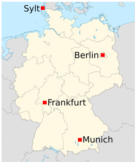 For the period, for which values are available in all months from January to December (1971–2021), data were extracted for 4 locations in Germany: Sylt, 54.9° N, 8.33° E, 16 m; Berlin, 52.5° N, 13.41° E, 36 m; Frankfurt, 50.1° N, 8.68° N, 112 m; Munich, 48.1° N, 11.57° N, 495 m. The selection of the locations aims to cover the span of the geographic latitude of Germany as far as possible (Figure 1). The locations are each about 2 degrees (2.0–2.4 degrees) apart geographically and (with the exception of Sylt) each represent regions with high population densities.