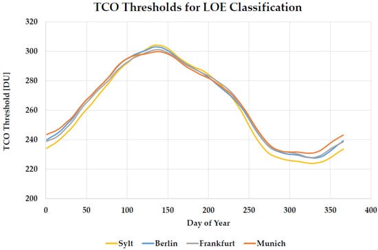 First, the number of LOEs is determined for each location. A uniform definition of the term LOE has not yet been established in the scientific literature. The method used here shows some parallels, but also differences to the approach of [52]. For each of the 4 locations, the mean daily TCO at local solar noon and its standard deviation is calculated for the entire period. A LOE (TCO) is defined here by the condition that the daily value of the TCO (at local solar noon) is less than or equal to the 30-day moving average of the difference between the long-term average and twice the standard deviation. On the one hand, this procedure avoids jumps at the end of the month, which are unavoidable when using monthly mean values of the TCO. TCO deviations in the range of up to −17 DU over the course of one month would be due solely to using the monthly means as a reference to identify the anomalies. On the other hand, the fact is considered that the study is carried out with a special focus on the possible health significance of LOEs. The human body adapts rather gradually to the UVR exposure that changes over the course of the year. Unsystematically varying daily thresholds, which would mean frequent (daily) fluctuations in the sense of progress, but also regression, of adaptation, do not seem plausible as a physiological reference and are avoided with the 30-day moving average. Ref. [52] uses monthly means of TCO and monthly means of TCO standard deviation, which are linearly interpolated to obtain daily values. To define an “extreme low ozone episode eLOE” [52], which corresponds to the LOE (TCO) in the present study, the value 2 of the quotient of the interpolated daily values of TCO monthly means and the monthly means of TCO standard deviation is used, which is equivalent to using twice the standard deviation and refer to value 1. Instead of the linear interpolation of the monthly means [52], the present study uses the moving 30-day average, which—with minor deviations due to the different month lengths—essentially corresponds to an improved, nonlinear interpolation of the monthly mean thresholds. Figure 2 shows the thresholds of the TCO for the 4 locations considered, which must be reached or fallen below depending on the day of the year for a classification as LOE (TCO). Although the mean TCO shows a north–south gradient with higher values in the north, the thresholds for the LOE classification for the 4 locations are relatively close, which is due to the fact that the standard deviation also shows a north–south gradient with higher values in the north.