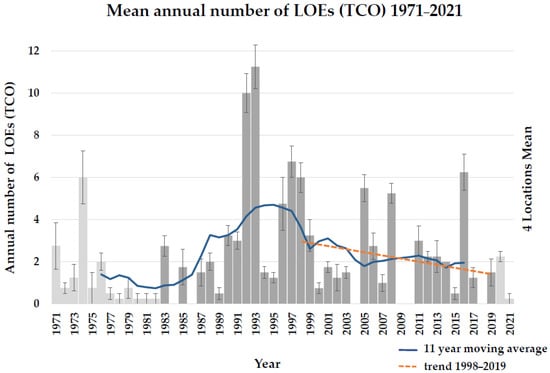 Mean annual number of LOEs (TCO) in the period 1971–2021 together with the 11-year moving average (blue line) and the linear trend of the subperiod 1998–2019 (orange dashed line), (4-location means and standard deviations).