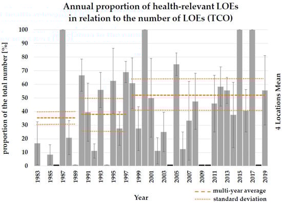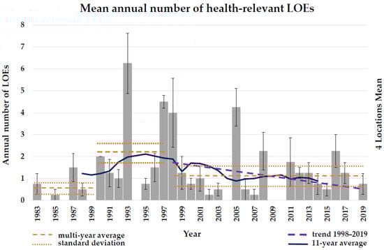 The four-location means of the annual number of health-relevant LOEs in Germany in the period 1983–2019 are shown in Figure 4.