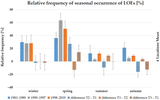 Mean relative frequency of seasonal occurrence of LOEs during the subperiods T1 (1983–1989), T2 (1990–1997), T3 (1998–2019) and changes between subperiods (4-location means and standard deviations).