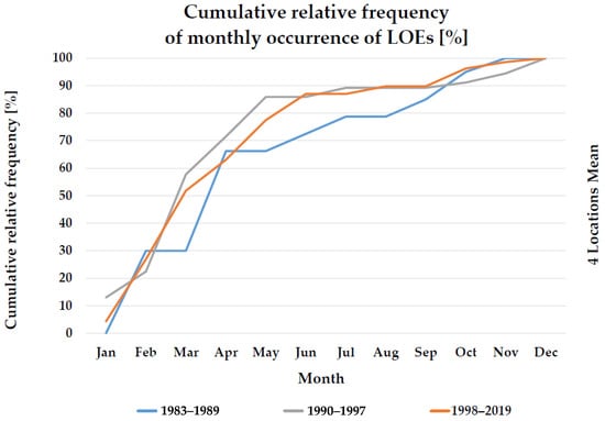 Mean cumulative relative frequency of monthly occurrence of LOEs during the subperiods T1 (1983–1990), T2 (1990–1997), T3 (1998–2019) (4-location means).