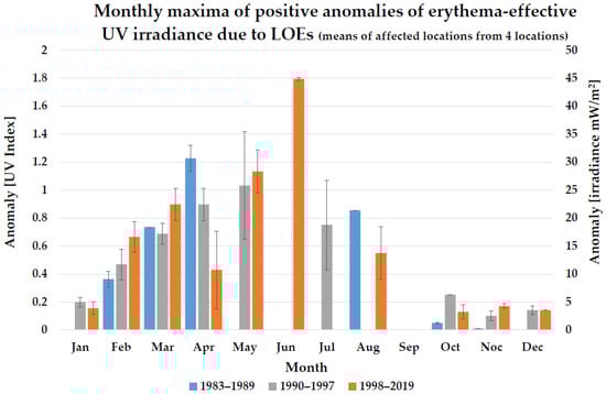 Figure 8 shows the monthly maxima of the positive anomalies of the erythema-effective UV irradiance associated with LOEs in the three subperiods. The mean values are calculated from the number of locations affected, i.e., four locations at most, but fewer locations if only some of them are affected.