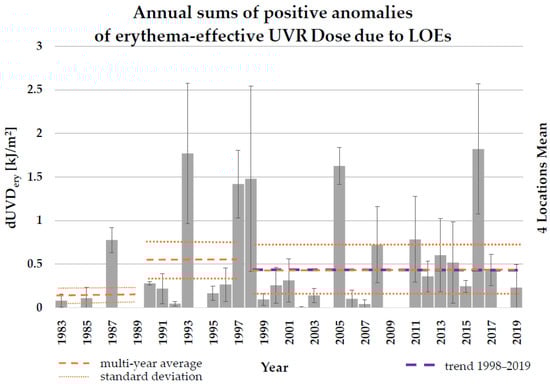 The seasonal mean values of the anomalies of the erythema-effective UVR dose per event follow the sun elevation with the largest values in summer. They do not show any significant differences during the subperiods T1 to T3, which can be interpreted as an expression of the variability of the occurrence dates of the rather rare individual events. Due to the rare and very variable occurrence of LOEs, the average annual total of the LOE-associated positive anomalies of the erythema-effective UVR dose contributes little to the total annual UVR dose (about 1/1000), even though it can increase to a multiple of its average value in individual years. In general, outdoor workers are particularly exposed to UVR, and as a result of their frequent exposure in the course of their work, are also more likely to experience increased UVR from LOEs. As part of the GENESIS UV study on UVR exposure values in 250 occupations [71], it was determined that the annual UVR exposure of the various occupations range from around 50 SED to 650 SED (1 standard erythema dose (SED) amounts to 100 Jm−2 [72]). In addition to occupational exposure, there is leisure exposure, which averages 130 SED [14]. If the largest annual UVR dose anomaly due to LOEs during the entire analysis period 1983 to 2019 (of the year 2016) is proportionally transferred to the personal exposure in a very rough estimate, then according to the present analysis, additional LOE-related UVR doses of 0.7 ± 0.6 SED to 3.0 ± 2.5 SED result for the sum of occupational and average leisure time exposure.
