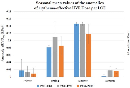 Figure 10 shows the seasonal mean values of the anomalies of the erythema-effective UVR dose per event.