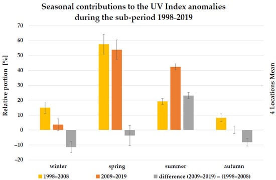 The seasonal contributions to the UV index anomalies during T3 and changes between the 1998–2008 and 2009–2019 half-periods of T3 are shown in Figure 11. Spring contributes the strongest proportions of UV index anomalies during period T3 (54 ± 7% to 58 ± 7%), followed by summer (19 ± 2% to 42 ± 2%). The changes between the two 11-year half-periods within T3 show a significantly increasing proportion of UV index anomalies in summer (+23 ± 2%), and smaller decreasing changes in proportions in winter (−11 ± 4%), autumn (−8 ± 3%) and spring (−4 ± 7%).