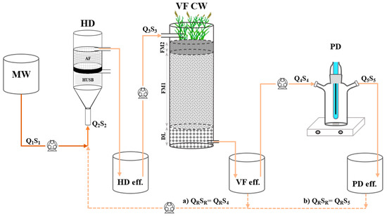 Scheme of the combined HD–VF–PD system with recirculation of VF effluent (a) or PD effluent (b). Acronyms: MW, municipal wastewater; HD, hybrid digester; VF, vertical flow unit; FM, filtering medium; DL, drainage layer; PD, photodegradation lamp; Q, flow; S, substrate concentration. Recirculation options: (a) from VF unit, (b) from PD unit.