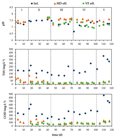 As for particulate matter, whilst the influent concentration to the HD was in range of 122–404 mg TSS·L−1, the HD effluent concentrations during periods I and II was below 125 mg TSS·L−1 (mean value of 54 mg TSS·L−1). In period III and following, TSS in HD effluent dropped to less than 41 mg TSS·L−1 (mean value of 21 mg TSS·L−1), indicating a very good retention of particulate matter. According to Winter and Goetz [46], VFs should receive a maximum influent concentration of 100 mg TSS·L−1 to avoid clogging, so the HD met this recommendation with an overall average effluent concentration of 34 ± 29 mg TSS·L−1. Overcome the start-up (period I), during periods II to V, the TSS effluent concentration from the VF unit was highly stable and averaged 19 ± 8 mg TSS·L−1. However, this concentration was only slightly lower than the HD effluent concentration, indicating a reduced retention of particulate matter in the VF unit. Total COD had an evolution similar to that of TSS, mean values for periods II to V decreasing from 424 ± 191 (influent) to 94 ± 39 (HD effluent) and 65 ± 22 (VF effluent) mg COD·L−1. During period V, the influent concentration of TSS and COD clearly increased (Figure 2) as well as the HLR (Table 1). However, the increase in TSS and COD effluent concentration was limited indicating the good performance of the combined HD–VF system at high SLR.