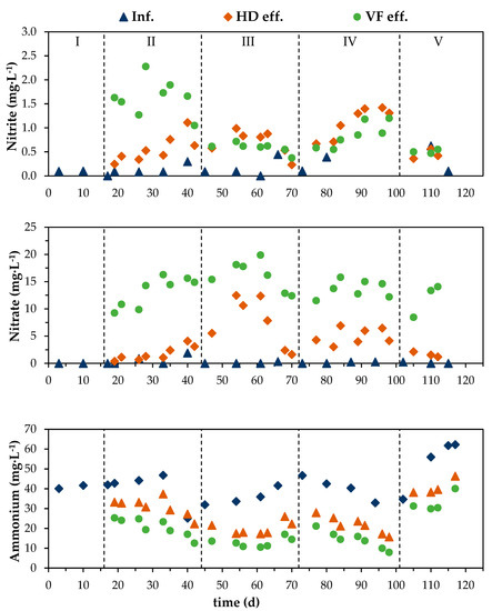 The evolution of nitrite over time was irregular, as an intermediate in the nitrogen cycle, but showed in general low values (Figure 3). The highest values of nitrite have been recorded during period II (1.6 mg N·L−1 on average for the effluent of the VF unit) whilst during the rest of the study the average concentration was maintained at values below 1.1 mg N·L−1, following the sequence HD effluent ≥ VF effluent > raw influent.