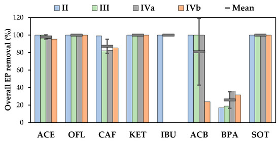Removal of individual EPs in the overall system is shown in Figure 5. Three compounds, OFL, KET, and SOT always reached 100% removal in the overall system. Nearly complete removal was obtained for ACE (98 ± 2%), CAF (87 ± 8%), and ACB (81 ± 38%) showing a slightly lower removal that indicated by Gonzalo [39], whilst BPA showed a very low removal of 26 ± 9%, as opposed to the 90% removal achieved by Gonzalo [38]. As indicated above, the IBU data were limited to period I, in which 100% overall removal was achieved.