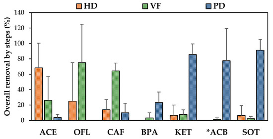 Overall removal of several EPs in the different steps of the combined HD–VF–PD system (* for ACB, mean of periods II and III only, because the intermediate concentration for period IV was not available) (Error bars: only value + standard deviation is shown). See Table 4 for pollutant abbreviations.