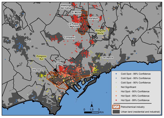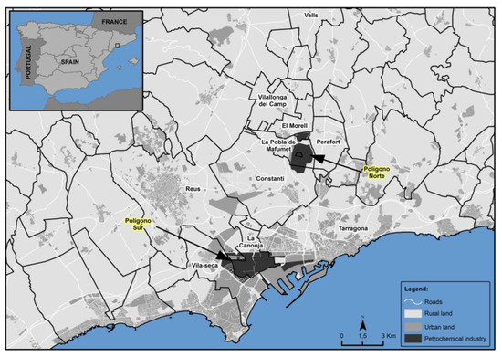 The coastal area of Camp de Tarragona represents a clear example of space that has suffered serious disorganization in a short period of time, concerning some fast processes of industrialization and town planning not subject to an appropriate master plan. The petrochemical refinery and other auxiliary companies arrived in Camp de Tarragona in two stages: the first between 1965 and 1970 (Polígono Entrevías de Tarragona—Polígono Sur) and between 1971 and 1980 (La Pobla de Mafumet and its vicinity—Polígono Norte). Implementing a pollutant activity has caused some significant environmental problems and, consequently, a reduction in the population’s quality of life (pollution, noise, smells, etc.) [20]. In fact, in response, the population in La Pobla de Mafumet filed a formal complaint because of the foul odors emanating from one of the new plants located in the refinery [21].