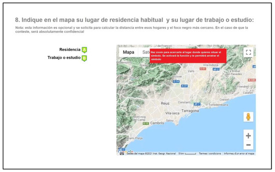In the first block of sociodemographic questions, apart from the usual ones on gender, age, level of education or employment status, others were added, such as the place of residence, work or study (indicating this on an interactive map, as shown in Figure 3 or indicating the postcode), in order to assess whether the distance influences risk perception. Additionally, the respondent was asked whether they have worked at any time in the petrochemical industry or if any direct family member has and, finally, whether from their place of residence they have direct views towards some of the petrochemical complexes in the area.